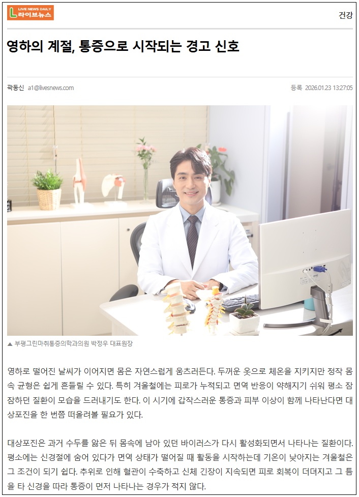 [언론보도] 영하의 계절, 통증으로 시작되는 경고 신호 작성일 : 2026.01.23 부평그린마취통증의학과 댓글 : 0 조회 : 308 [기사 원문 보러가기] https://www.livesnews.com/news/article.html?no=58924 자세한 내용은 링크를 클릭하시면 확인하실 수 있습니다.